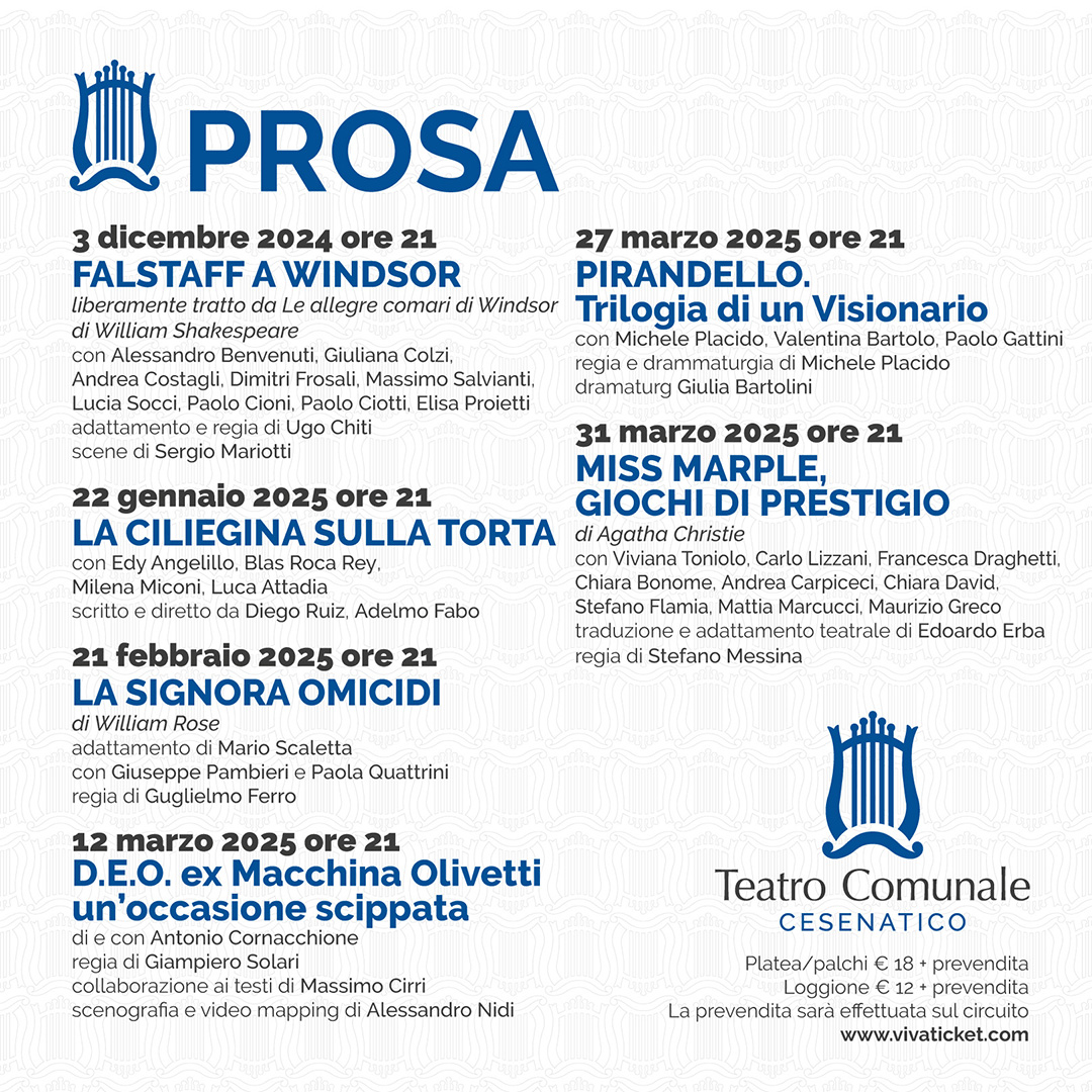 Da novembre spettacoli di prosa con grandi nomi del teatro contemporaneo, mentre l’anno nuovo comincia con uno spettacolo di danza dei ballerini del Teatro alla Scala. Confermati gli appuntamenti del teatro dialettale, di “Cesenatico Classica”, del “Musical” e delle “Favole”.